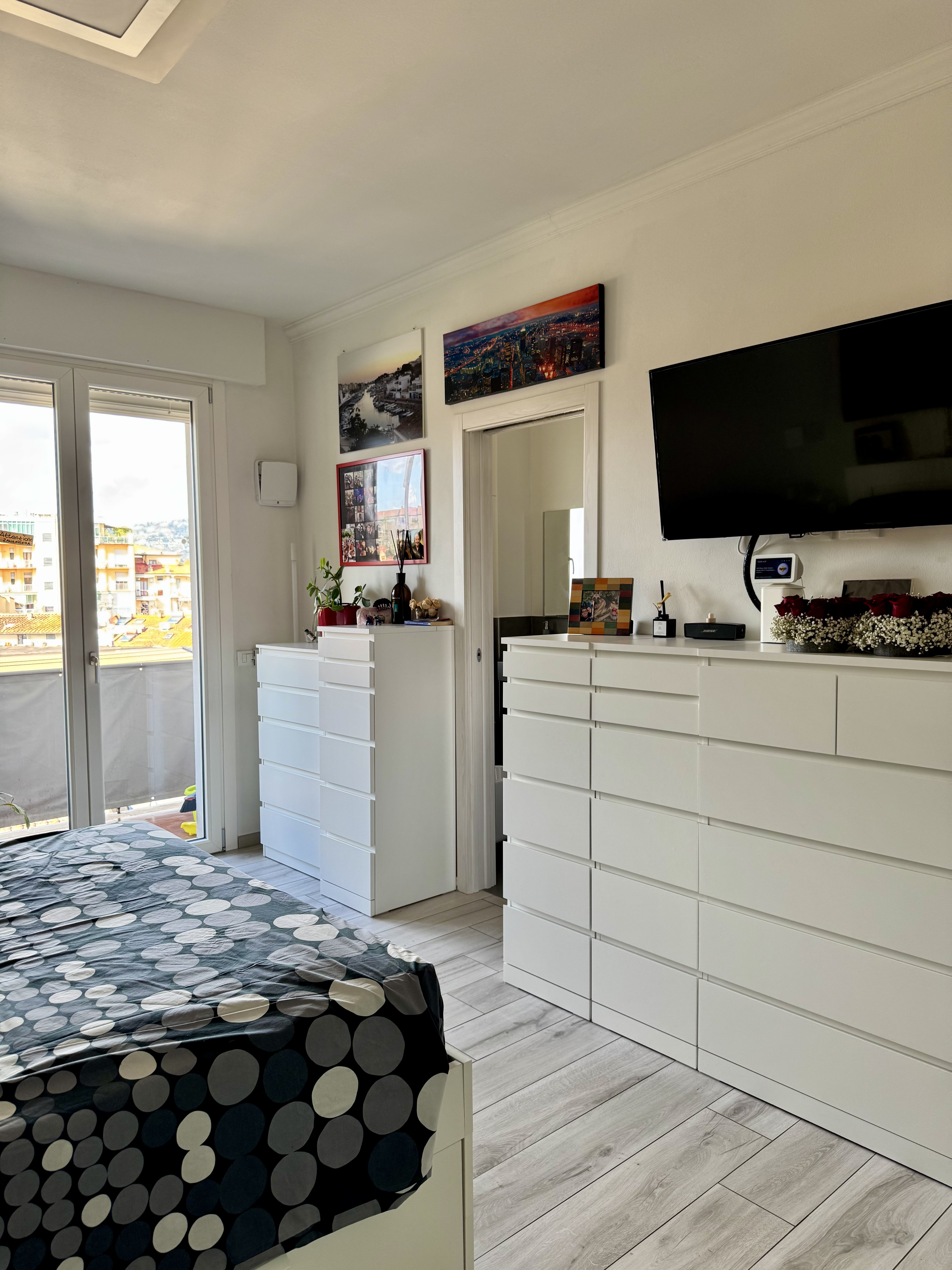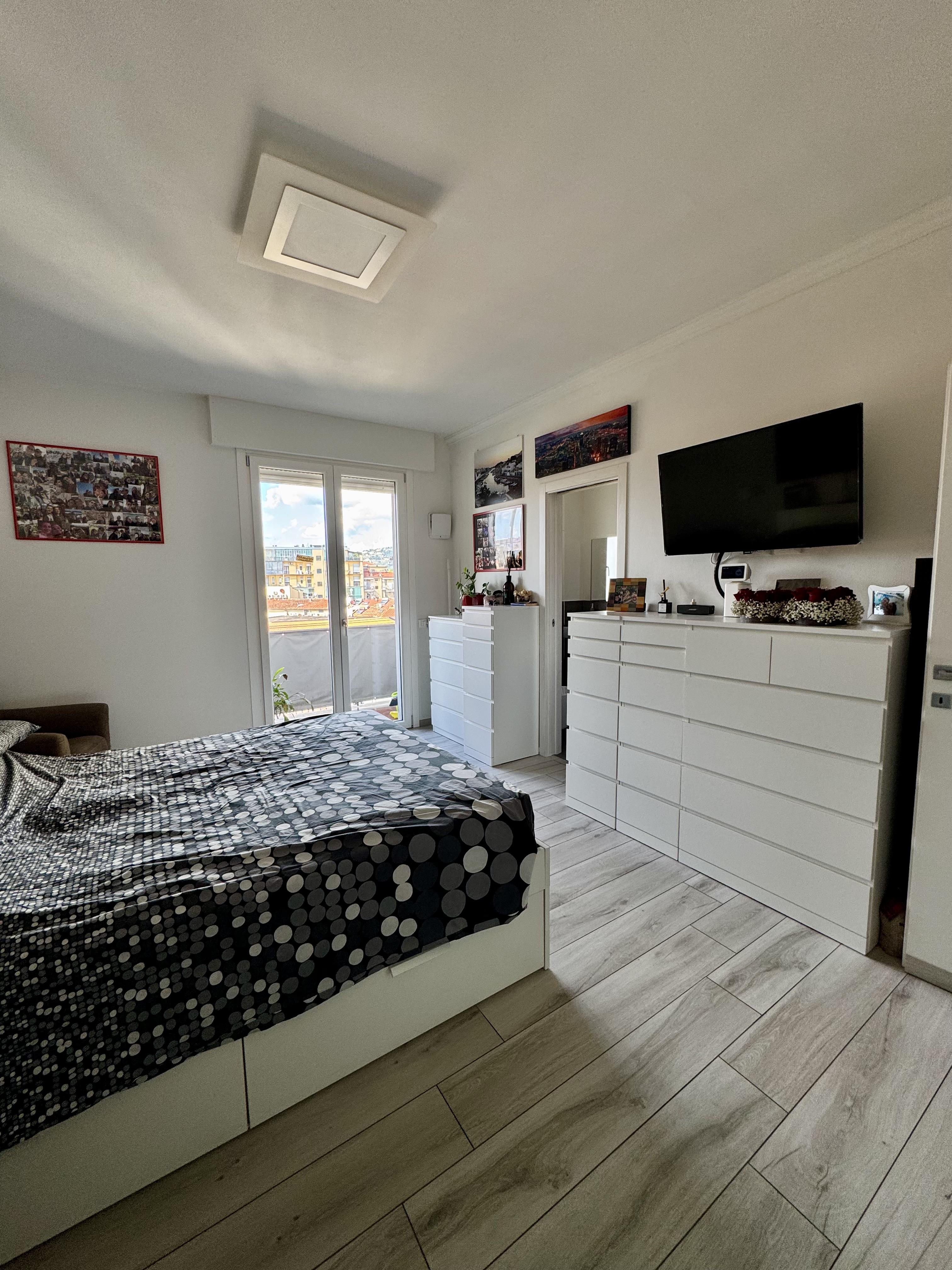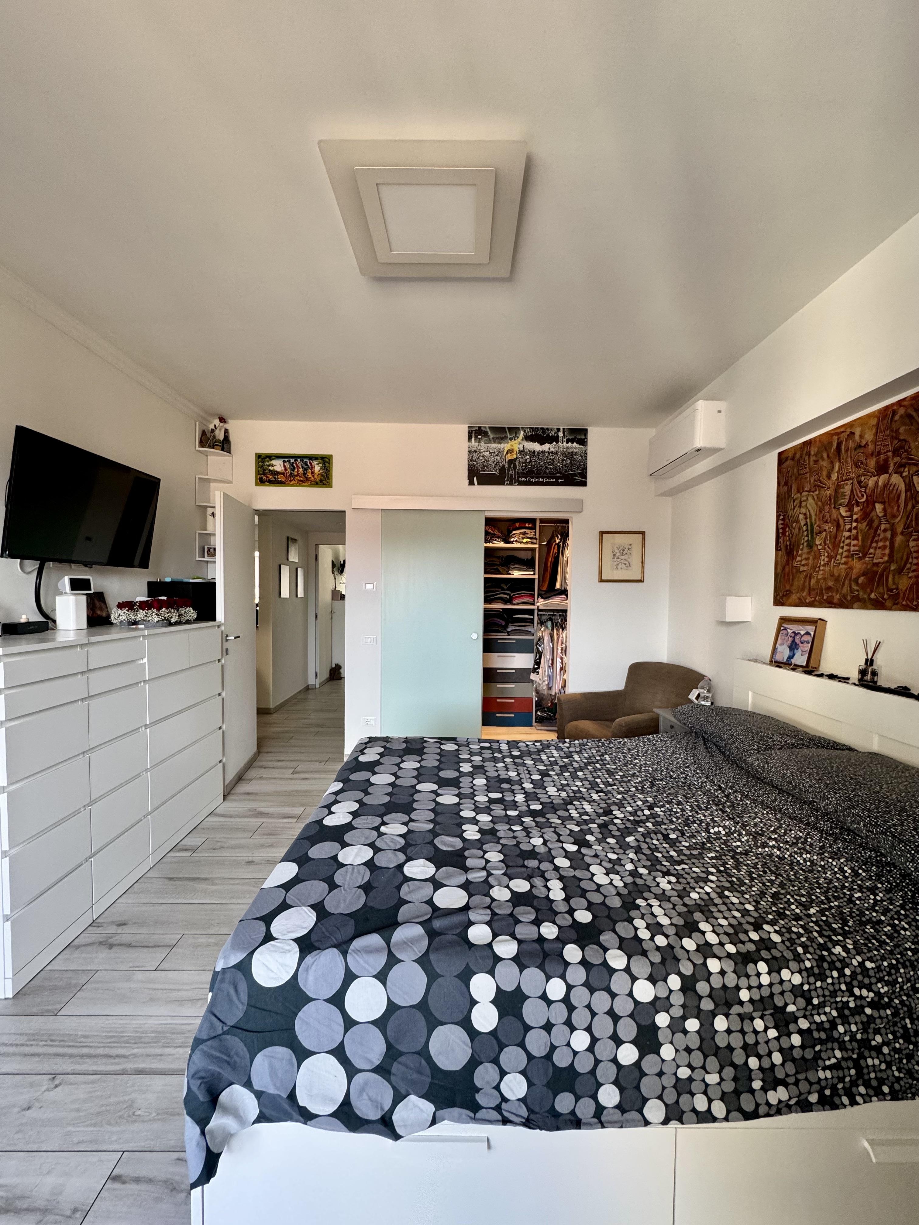 Seconda camera matrimoniale con cabina armadio su misura (compresa nel prezzo) e bagno en suite finestrato completo di box doccia. Questa camera affaccia sul terrazzo in continuità con quello della cucina.