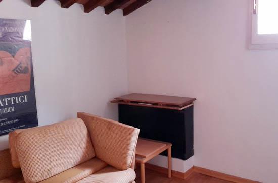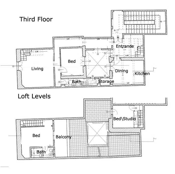 Posto al terzo ed ultimo piano (69 facili gradini), di un bel palazzo Fiorentino proptetto dalle Belle Arti, questo appartamento e’ diposto con due livelli soppalcati per un totale di circa 120 metri quadrati. Abbiamo un ingresso dal quale si accede al primo soppalco con una camera singola o studio, una stanza da pranzo con cucina a vista, un soggiorno con camino e belle viste su piazza Santa Croce ed il Duomo; inoltre abbiamo una camera matrimoniale ed un bagno con doccia. Dal soggiorno si accede al secondo livello soppalcato con una camera matrimoniale, un bagno con doccia ed un accesso ad una terrazzina balcone tergale. La casa ha termo singolo ed aria condizionata.